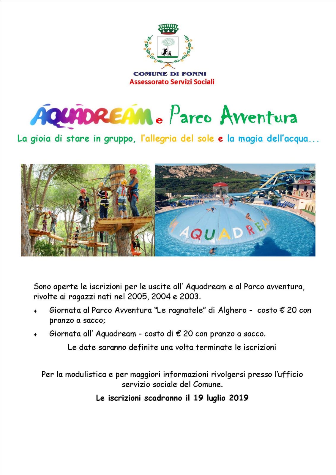 Sono aperte le iscrizioni per le uscite all'Aquadream e al Parco avventura , rivolta ai ragazzi nati nel 2005,2004 e 2003.